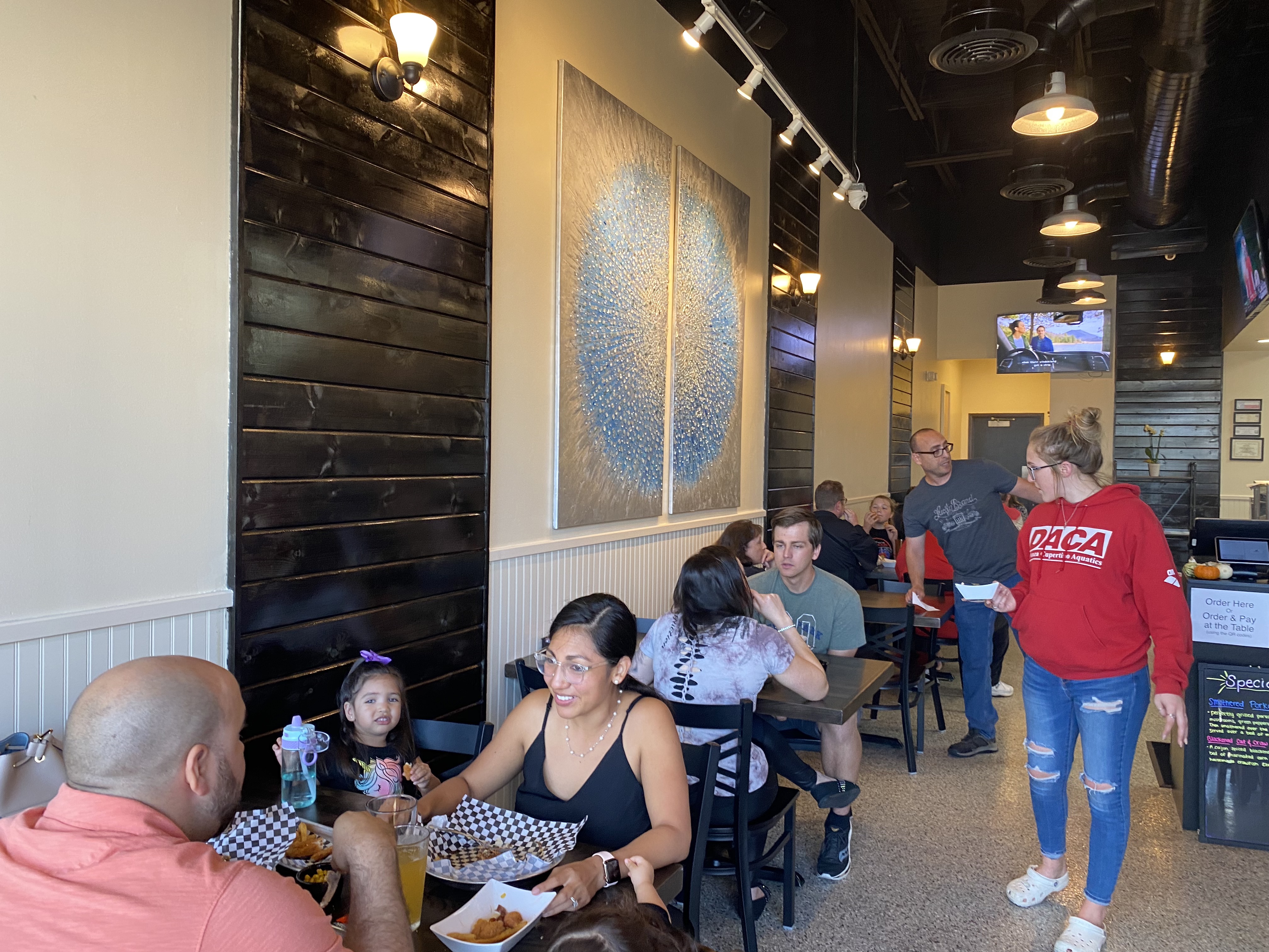 Most of the restaurant’s staff stays in the open-concept kitchen, furiously working like a well-oiled machine to get orders on the table or ready for pick-up with impressive speed. The dining room staff brings out the food and helps new customers get acquainted with the menu and how to order. The ordering for dine-in, carry-out, and delivery orders is mostly done self-serve, leveraging tech powered by Toast. Drinks, even beer and wine, are self serve.