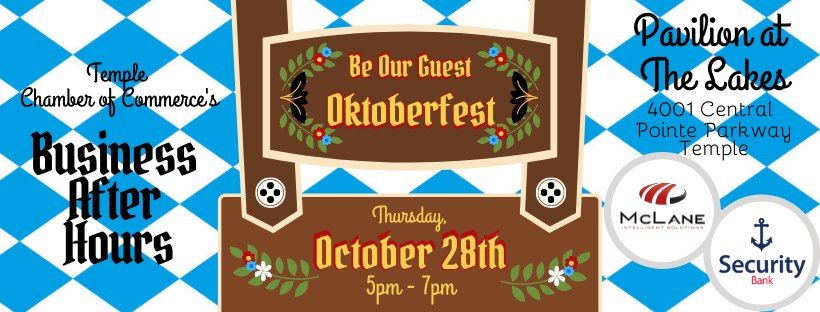 Temple Chamber of Commerce – Join us for the Oktoberfest Business After Hours sponsored by McLane Intelligent Solutions & Security Bank on Thursday, October 28th, 2021, from 5:00 – 7:00 PM at 4001 Central Pointe Pkwy, Temple, TX 76504.