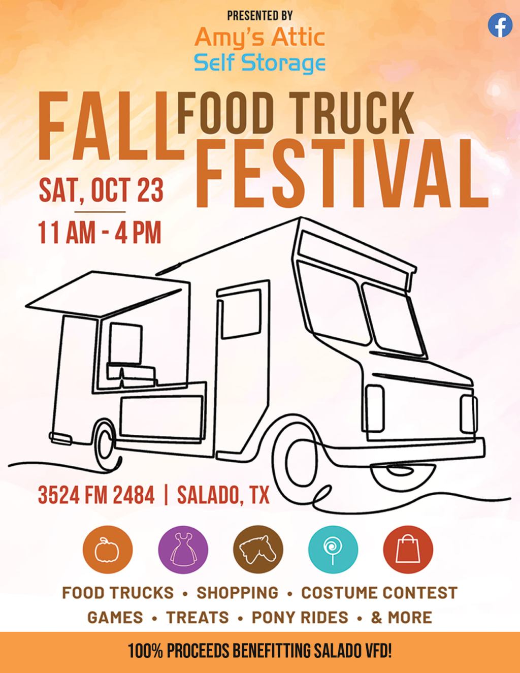 The Fall Food Truck Festival is happening today in Salado at 3524 FM 2428. Attendance is FREE and so are the activities such as the kids’ costume contest and treat bags, inflatables, pumpkin decorating and more!100% of all of the proceeds goes to Salado Texas Volunteer Fire Dept and they will be there with the fire trucks!