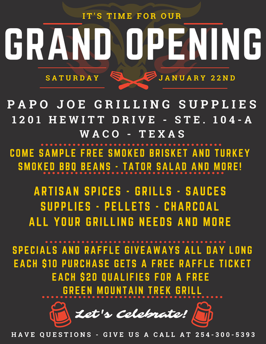 Papo Joe Grilling Supplies Waco will be celebrating its grand opening at 1201 Hewitt Drive on Saturday, January 22. Papo Joe is a grilling supply store that specializes in grills, spices, sauces, accessories, pellets, charcoal, and wood. The Waco location is the fourth location for Papo Joe Grilling Supplies.