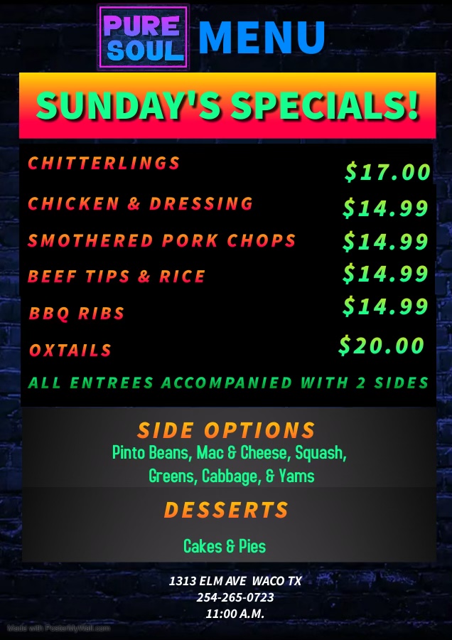 If smothered pork chops, oxtails, and mac & cheese make your mouth water, head over to Elm Avenue and give Waco’s newest soul food shop a try. Pure Soul offers carry-out meals at 1313 Elm Avenue. Call (254) 265-0723 to order in advance or inquire about catering.