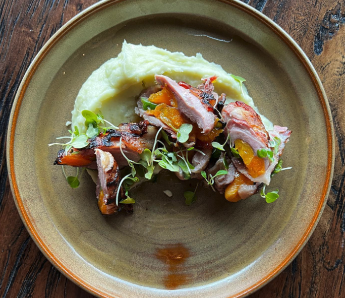 Featured image: Bacon-wrapped quail breast, stuffed with apricot and jalapeño, served with mashed potatoes by Oak & Ivy Wine Bar Bistro