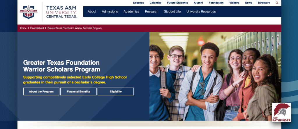 Texas A&M University–Central Texas has received a $1.56 million grant from the Greater Texas Foundation to support the GTF Warrior Scholars Program. The program, set to launch in fall 2023, will benefit Early College High School (ECHS) students who transition to the university to complete their bachelor’s degree. The grant will provide scholarship assistance of at least $2,000 per year for up to three years to 40 ECHS students enrolled in the first five cohorts. Scholars will also participate in learning communities and workshops focusing on student success initiatives. Interested students can apply for the scholarship on the university’s website. A&M–Central Texas is the state’s only upper-division university and offers affordable tuition and financial aid options. The university is developing plans to identify and communicate with eligible students for the GTF Warrior Scholars Program.