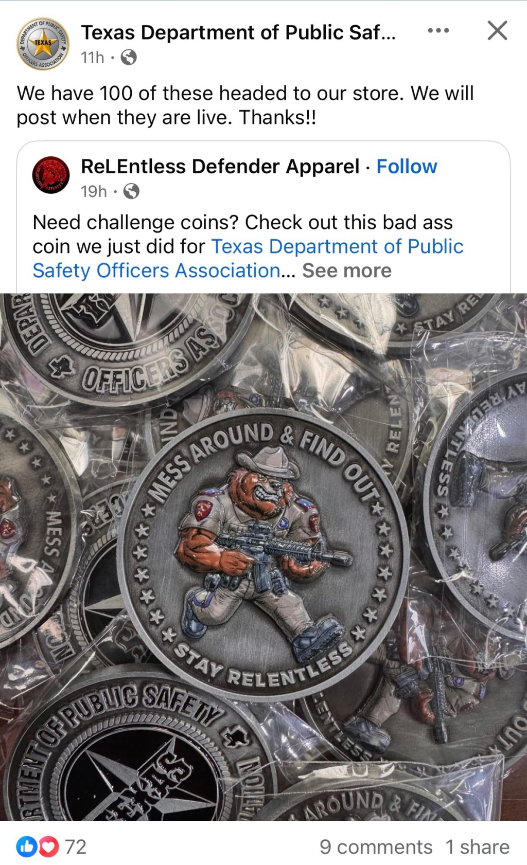 Texas DPS Officers Association Promotes Controversial “Mess Around and Find Out” Challenge Coin on Social Media